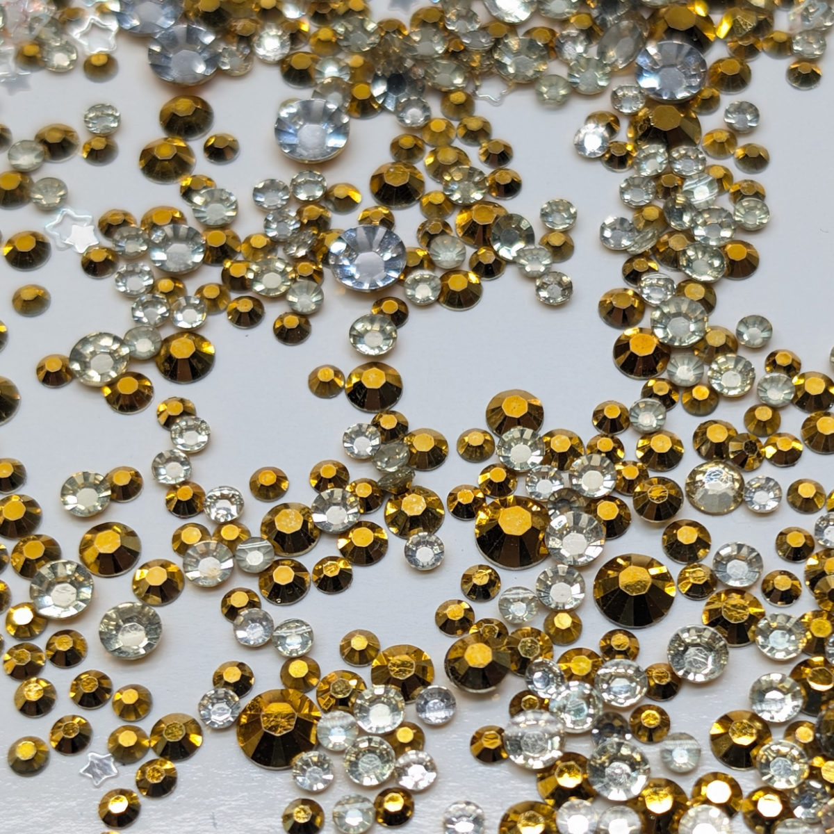 Each rhinestone features a brilliant crystal base with a metallic golden top, creating a unique two-tone shimmer that catches the light beautifully.